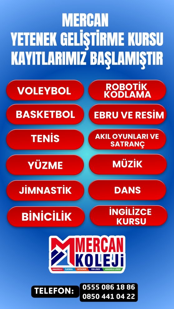 Mercan Yetenek Geliştirme Kurs Kayıtlarımız Avantajlı Fiyatlarla Başladı. Voleybol, Basketbol , Futbol, Tenis, Yüzme, At Binme, Jimnastik, Robotik Kodlama, Ebru ve Resim, Akıl Oyunları ve Satranç, Müzik, Dans, Kur Programlı İngilizce, Çocuk İngilizcesi Mercan Yetenek Geliştirme Kursları Kayıtlar ve Kontenjan için 0555 086 1886, 0850 441 0 422 Mercan Kolejinin Muhteşem Kampüsünde Malatya’nın En Deneyimli Öğretmen ve Antrenörleriyle Yeteneklerinizi Geliştirin