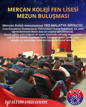 Mercan Koleji Eğitim sektöründe çeyrek asrı aşan tecrübesiyle kurulduğu günden bu yana gelişimi ve başarıyı kendine ilke edinen Mercan Koleji dünya vatandaşı başarılı nesiller yetiştirtiriyor. Ulusal ve uluslararası bilimsel, kültürel, sanatsal, sportif yarışmalarda, lise ve üniversite giriş sınavlarında göstermiş olduğu başarılarla ülkemizde örnek gösterilen bir kurum olmanın haklı gururunu yaşıyor.Mercan Koleji Malatya Kampüsü EN İYİ Anaokulu, İlkokul, Ortaokul, Fen Lisesi, Anadolu lisesi